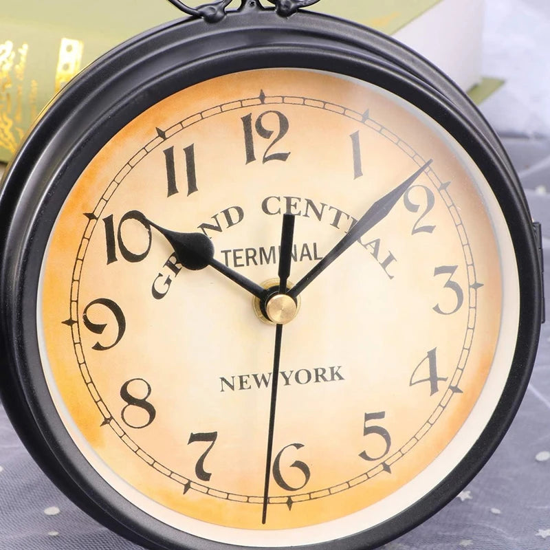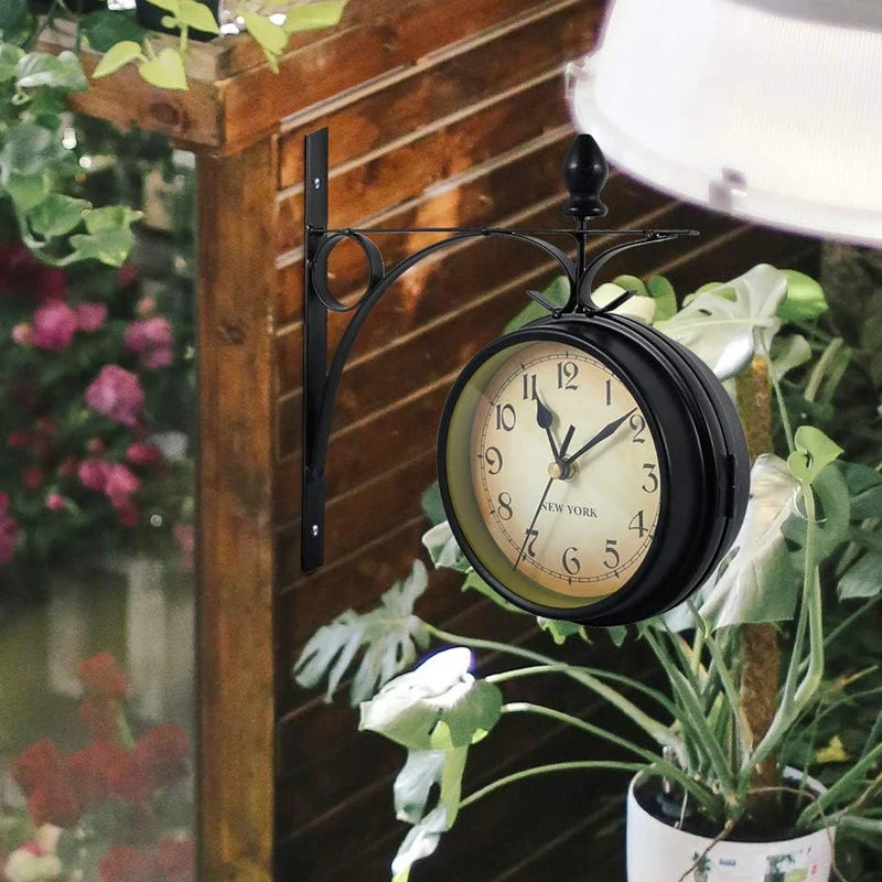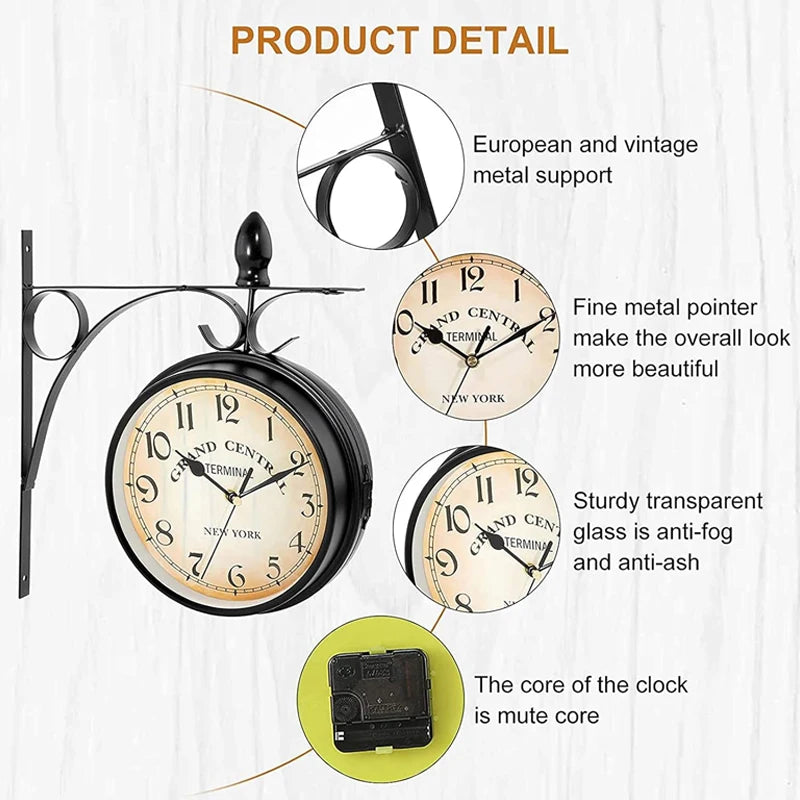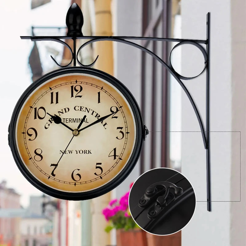 تتميز بساعة مزدوجة الجوانب في حامل حائط عتيق يسهل تعليقه.