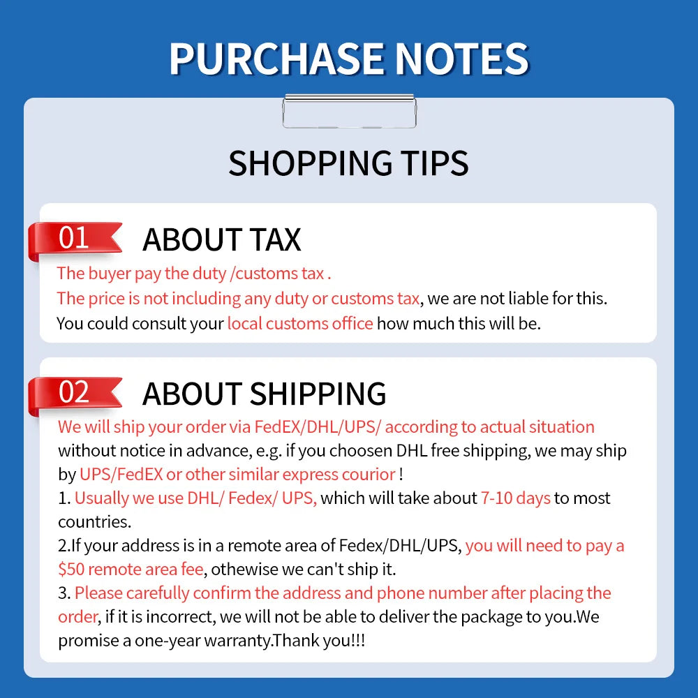 1. Habituellement, nous utilisons DHL/ Fedex/ UPS, ce qui prendra environ 7 à 10 jours pour la plupart des pays. 2. Nous ne sommes pas responsables du temps de transit du transporteur. Ces informations sont fournies par le transporteur et excluent les week-ends et jours fériés. Notez que les délais de livraison peuvent varier, notamment pendant les périodes de pointe ou dans des conditions météorologiques défavorables. 3. Tous les articles seront envoyés directement depuis notre entrepôt en Chine.