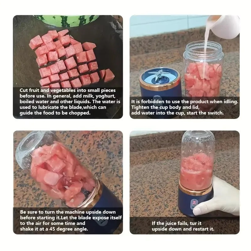 1. Ricarica USB: il mixer portatile semplifica la ricarica tramite la sua connessione USB, comoda per ricaricare ovunque. Il tempo di ricarica rapida è di circa 3-4 ore e la ricarica completa può supportare 5-10 utilizzi, garantendo che il rifornimento quotidiano di acqua sia sempre a portata di mano.