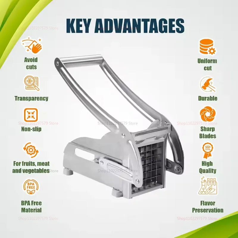• Eersteklas roestvrijstalen constructie — Deze frietsnijder is gemaakt van hoogwaardig, roestbestendig en waterdicht roestvrij staal en zorgt voor langdurige duurzaamheid en betrouwbare prestaties in drukke keukens. Gemakkelijk schoon te maken en te onderhouden, en is gebouwd om dagelijks gebruik te weerstaan.