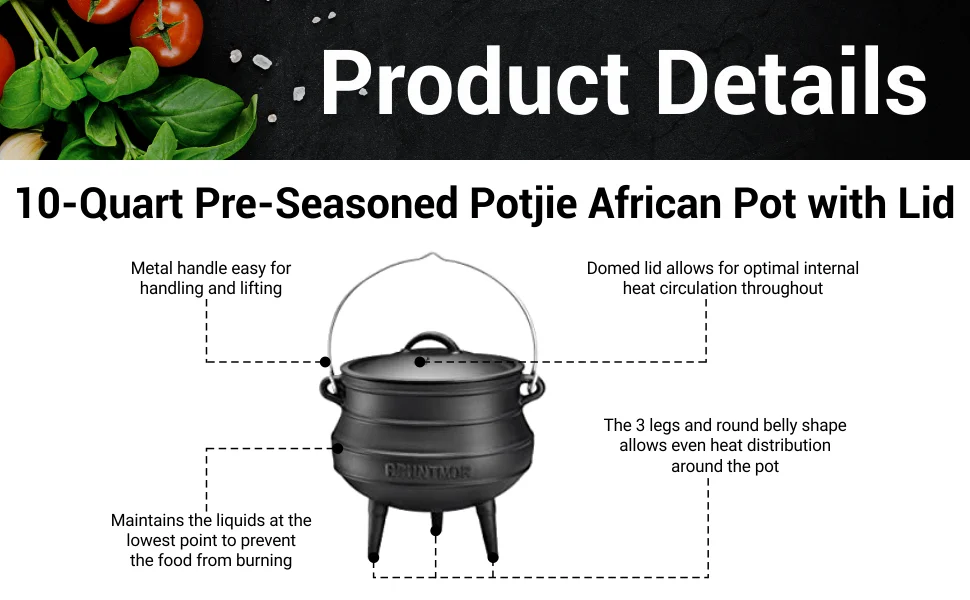 1. 12 Quart Cast Iron Dutch Oven Cauldron Pot - Camping Cookware with Lid - Pre-Seasoned Heavy-Duty Potjie for Stews, Soups, Braising, and Frying Over Fire Pit Grill or Camp Stove - Black