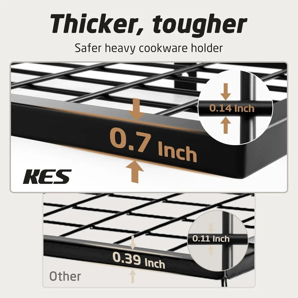 - Creates & Organizes Kitchen Space: KES pan organizer effectively uses your kitchen wall space and provides 12 hooks for storing iron pots, mixing bowls, ladles, and stainless steel pans. Everything you need for cooking will always be within arms' reach, easy to spot, and organized.