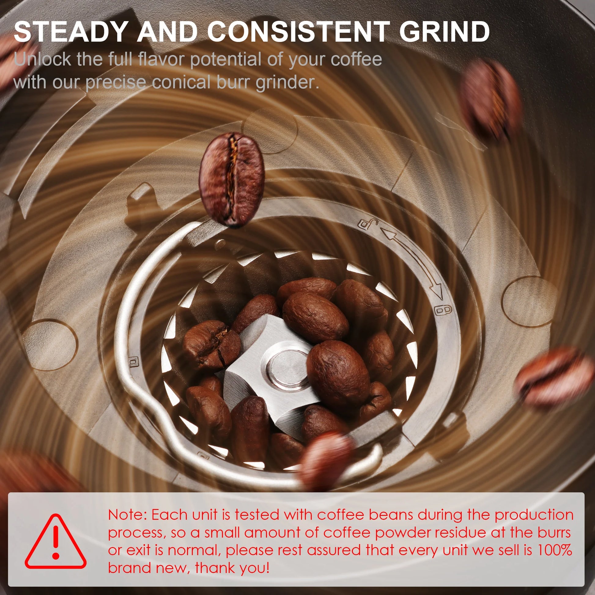 【 Durable Conical Burr 】- 40 millimeter stainless steel conical burrs designed to minimize grinding heat and protect the essential oils in the coffee bean, creating consistent coffee grounds and optimal flavor extraction.