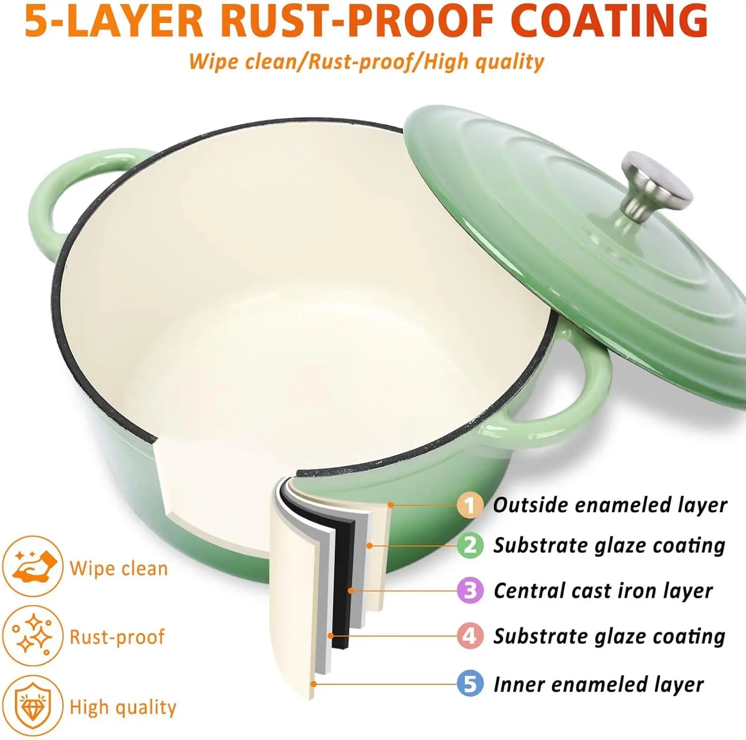 3. [Premium Ceramic Coating for Easy Use] - Crafted with 5 layers of durable ceramic enamel coating, this ceramic cast iron cookware set ensures effortless easy-cleaning performance. The layers include a sturdy cast iron interior, base glazes, and an exterior enamel, making it resistant to cracking, scratching, and chipping. The PFOA, PTFE, lead, and cadmium-free coating makes cooking healthier, while messes can be wiped clean with a single swipe - your trusted partner in easy, enjoyable cooking.